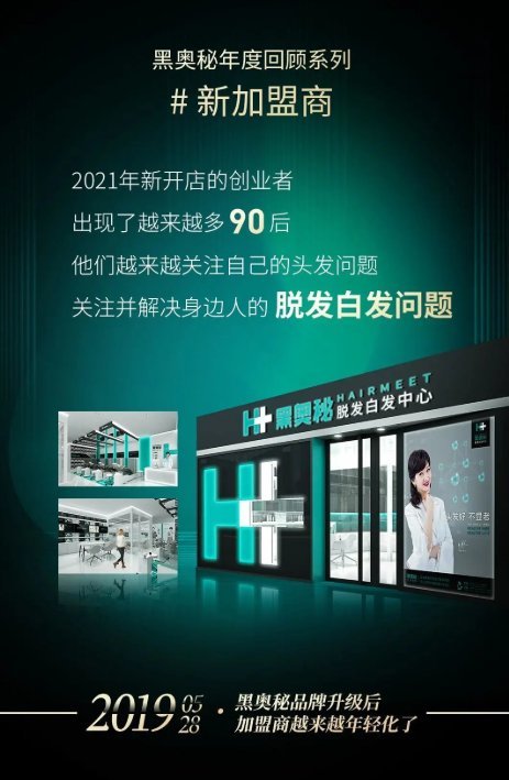 首先,是加盟商的年轻化。据公开数据显示,黑奥秘2021年新增的180余家新店,创业者年龄以30岁左右为主,相比去年加盟商年龄,加盟商年龄在2019年5月28日黑奥秘品牌升级后,越来越年轻化了。90后也越来越关注头发问题,更希望在红利期的好赛道中,有自己的独立发展空间。