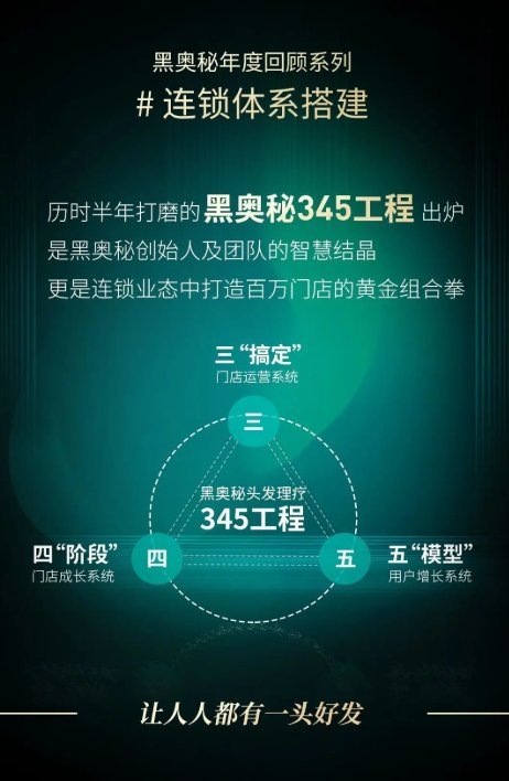 更完善的组织、更稳固的连锁运营系统、更敏锐能打的团队、更强大的研发机构、更立体的脱发白发产品、更大的战略目标,黑奥秘一步一步引领着变革,一步一步实现“让人人都有一头好发”的使命,这是黑奥秘以及黑奥秘全国门店的使命。
