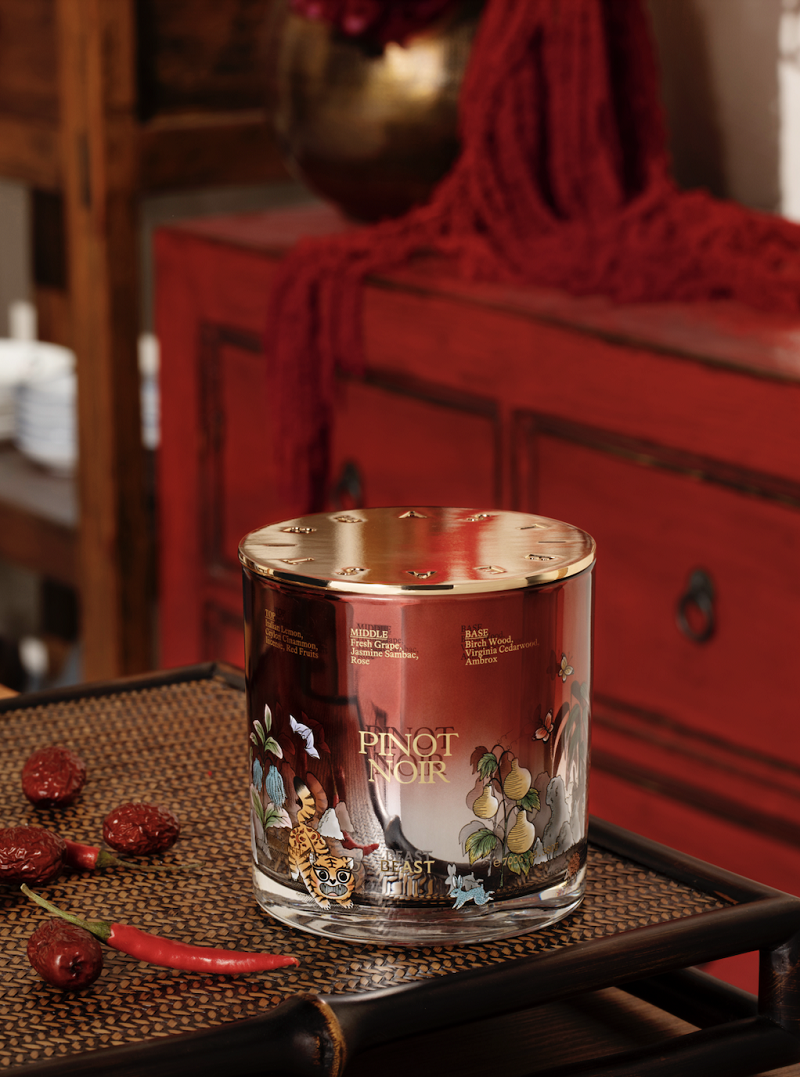 野兽派以花艺为DNA,秉承中国传统美学并融入时尚设计元素,为2022传统虎年献上了一份特别的贺礼。醉虎下山系列香氛产品包含香水、超大香槟桶蜡烛、香薰礼炮、小温暖礼盒等,将果香与酒香交织,似一瓶勃艮第美酒已被打开,令人迷醉,此等香气怎不引得老虎贪杯,醉眼朦胧,摇摇晃晃下山而来,野兽派新年限定醉虎下山因此得名而来。