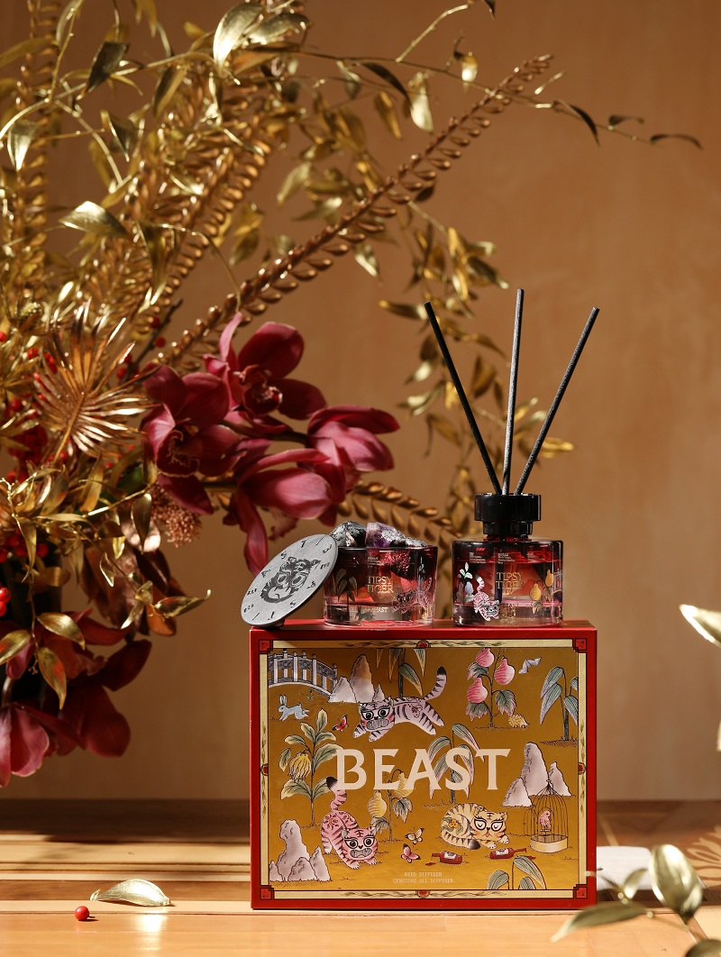 野兽派以花艺为DNA,秉承中国传统美学并融入时尚设计元素,为2022传统虎年献上了一份特别的贺礼。醉虎下山系列香氛产品包含香水、超大香槟桶蜡烛、香薰礼炮、小温暖礼盒等,将果香与酒香交织,似一瓶勃艮第美酒已被打开,令人迷醉,此等香气怎不引得老虎贪杯,醉眼朦胧,摇摇晃晃下山而来,野兽派新年限定醉虎下山因此得名而来。