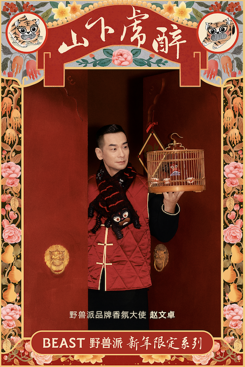 赵文卓身穿中式盘扣马甲,怀抱棕色大老虎,舞得虎虎生风,更手拿醉虎拜年春联,送上新年虎气冲天的祝福。辞旧迎新之际,群星与野兽派「醉虎下山」虎年限定系列产品的梦幻联动,让这个新年充满生机和活力,对新年贺礼也有了别样的期待。