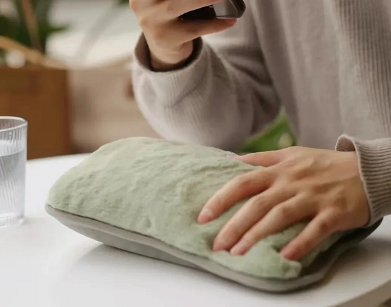 由于暖手饼加热后表面温度最高可达90度左右,为防止灼伤,充完电之后一定要装进绒布套内使用。