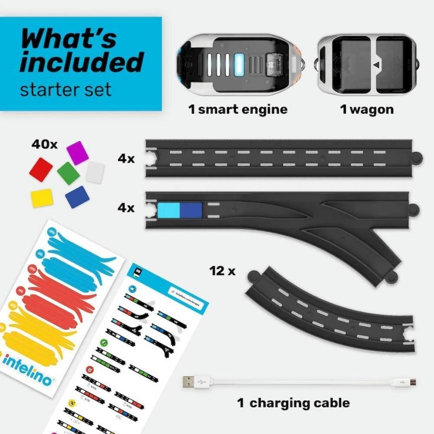 intelino 英荔诺智能小火车的入门套装主要由火车头、车厢、轨道、动作代码块、充电线等物料组成。