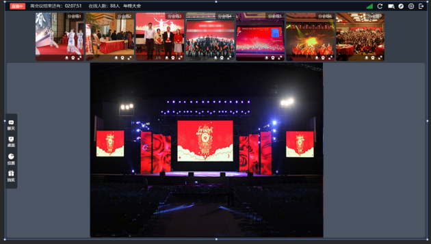一些大规模的企业举办年会时,会选择在各地的分公司同时间进行直播,主会场和分会场实时连麦互动,线上视频无障碍接通,员工在异地也能感受并参与到精彩的年会直播之中,这也就要有靠谱的直播平台、稳定流畅的直播系统以及丰富多样的互动功能,这样才能在年会直播间中容纳更多人员同时在线和互动。