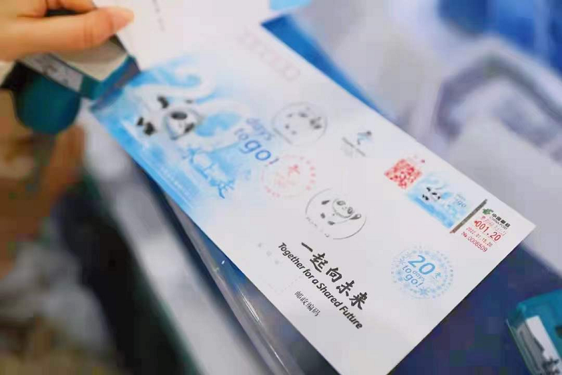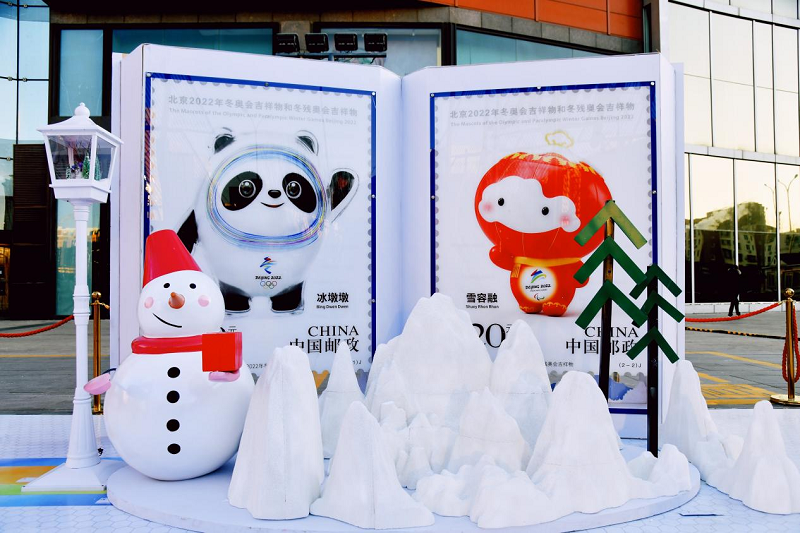 这是本次快闪活动的第一个打卡点——巨型邮票册。左侧邮票名称是:北京2022年冬奥会吉祥物;右侧邮票名称是:北京2022年冬残奥会吉祥物。邮票印制采用艺术化手法,在版张边饰上镂刻出若隐若现的雪花造型,进一步营造出冬季冰雪运动的浪漫氛围。