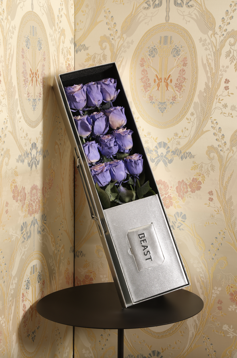 “仙女紫”枪炮玫瑰拥有丝绒质地,层层叠叠,在复古摩登的银色枪炮花盒中,静候爱人亲启。