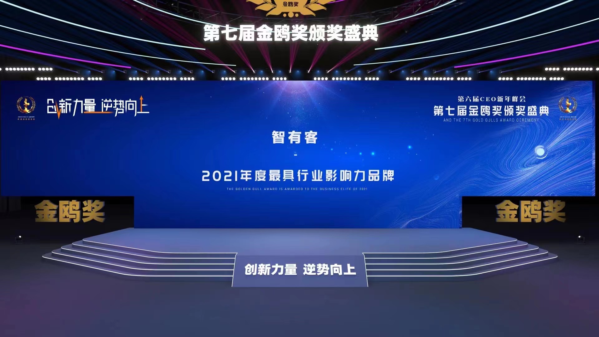 基于企业发展过程中体现的卓越创新力和良好的经营管理数据,在活动上,主持人宣布智有客获评金鸥奖2021年度最具行业影响力品牌。