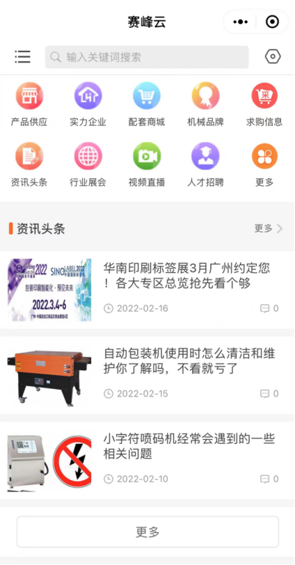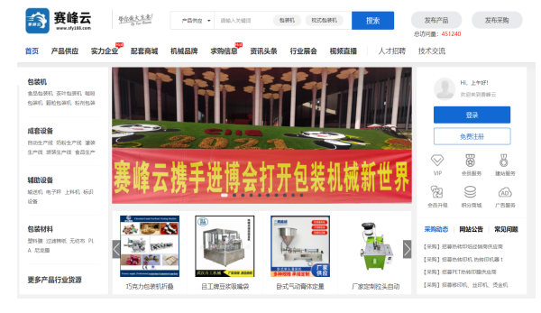 赛峰云现有供应、采购,配套商城、资讯、展会、视频等多个服务频道,内容真实、及时、丰富,专业,数据量大,活跃度高,旨在更专业、及时的服务于行业人士,是包装机械行业内集B2B与人脉功能于一身的专业平台。