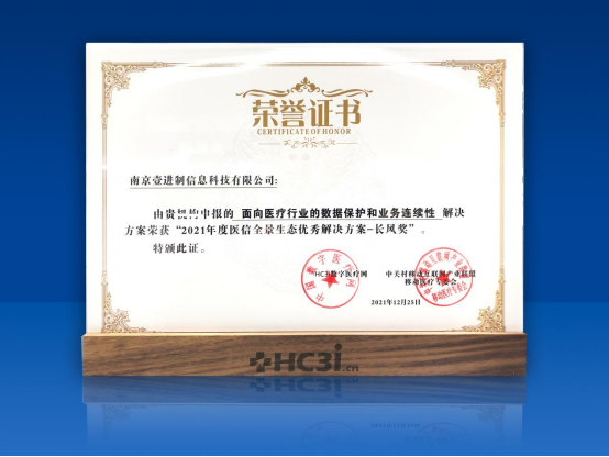 近日,2021医信全景生态优秀解决方案年度颁奖典礼在北京隆重举行。航天科工南京壹进制在众多医疗品牌中脱颖而出,凭借面向医疗行业的数据保护和业务连续性解决方案荣获“2021年度医信全景生态优秀解决方案-长风奖”。