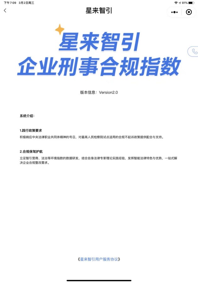 星来律所自成立以来,以“助力企业构建规范合规体系”为使命,专注于创新的企业合规业务,将精专的法律知识同先进的合规思维、实践经验结合,开创出合规领域独树一帜的法律服务品牌。在立所一周年这个具有里程碑意义的日子里,星来律所与北京星来科技有限公司共同研发、独立运行的国内首款以企业刑事合规为核心内容的数字产品——“星来智引--企业刑事合规指数2.0”(以下简称“星来智引 2.0)正式官宣面世!
