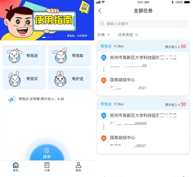 使用方式很便捷简单,一个软件即可接单,也能下单。进入小程序或者APP之后接单跑腿用户可以直接看到首页小喇叭直接显示附近订单,也能在首页点击“接单”,输入搜索目的地即可接取附近与自己目的地一致的订单,出行、跑腿挣钱两不误。与大多数跑腿软件一致,下单的用户发布订单点击首页“帮我取”等按钮,按需求发布订单即可,同时该平台下单价格自定义,目的是希望为社会互助互信贡献一点力量,希望以后能1元帮带。同时推出全民合伙人模式,在我的团队里分享右上角邀请码邀请新用户成为你的团员,团员完成订单平台会分佣给团长,不影响接单人员的收入。
