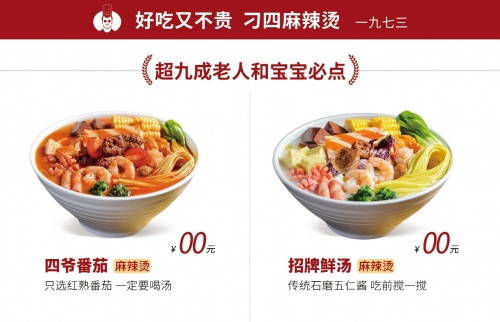 其实,麻辣烫门店在大多数城市都已经达到饱和,尤其是近几年来,大街小巷的麻辣烫门店越来越多,要想成功吸引消费者,就必须求新求异。刁四麻辣烫在产品营销上别出心裁,按照不同身份不同年龄层进行用户画像,精准推荐不同美食:比如超九成白领女性最爱的招牌微辣麻辣烫、四爷番茄麻辣烫,超九成老人和宝宝必点招牌鲜汤麻辣烫,超九成猛男爱吃的麻辣香锅等,帮助消费者在1分钟内迅速决策,提升转换率,让门店更赚钱。