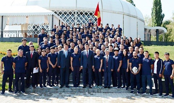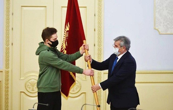 出征前,吉尔吉斯斯坦运动员马克西姆·戈尔杰耶夫与吉国总理进行国旗交接