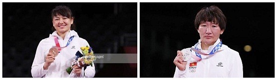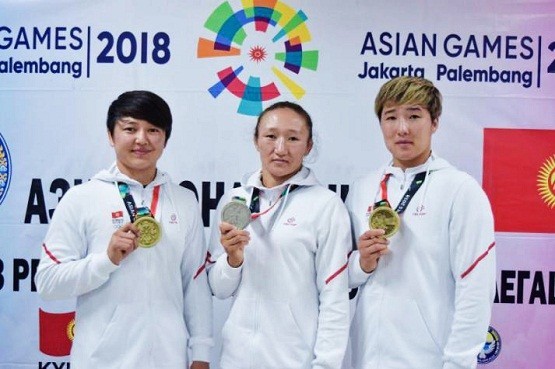 吉尔吉斯斯坦摔跤运动员艾思露·特尼别科娃(中间)摘得银牌