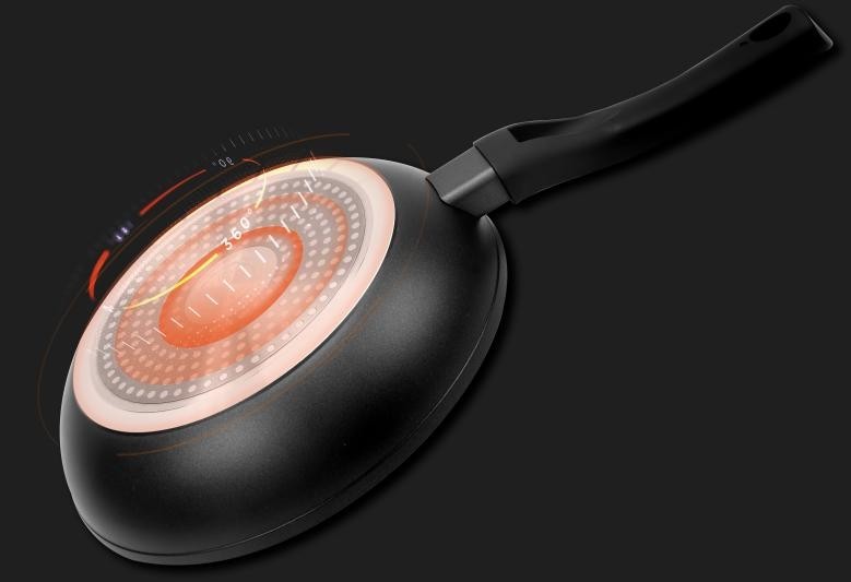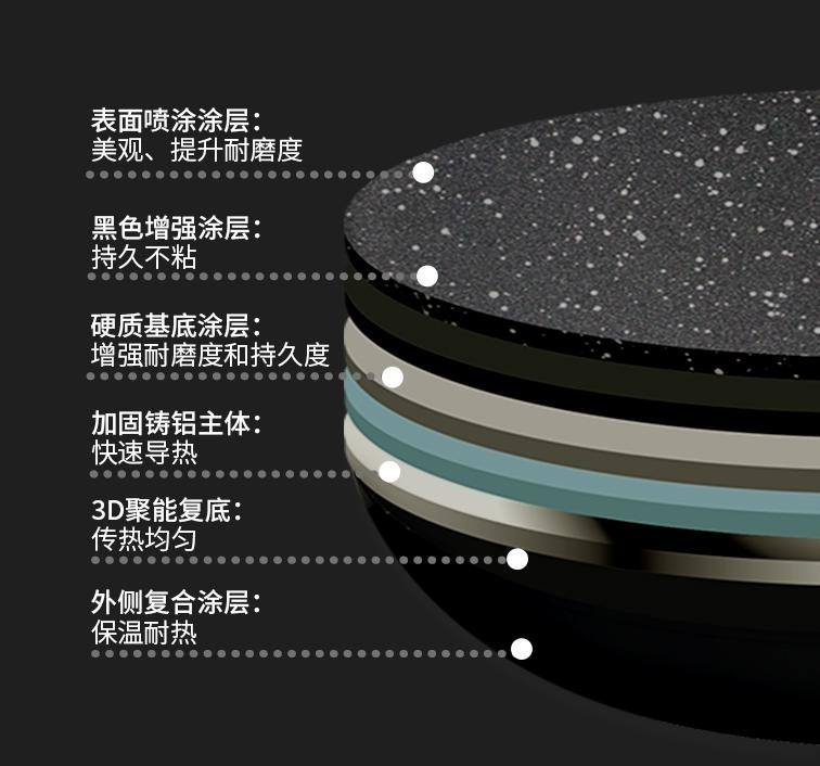 符合人体工程学的手柄,是产品设计的一个里程碑。外观呈现朴素经典的黑色,繁星的点缀令人赏心悦目。环保铝材的工艺优化,使锅体更加轻盈拿取方便,让主妇和老人也能轻松颠勺。3D聚能锅底可将热能储存并均匀传导,烹饪食物更高效更节能,复合锅底还可在燃气灶、电磁炉、电陶炉等不同热源上大显身手。