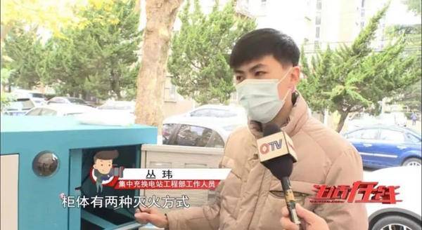 核蜂换电工程部丛玮表示道:“柜体有两种灭火方式,其中一种在柜内自行感应式的热气溶胶灭火装置,柜内温度传感器感应柜内的温度达到一个阀值,会爆出气溶胶对电池形成保护,以防止造成更大的伤害和破坏,另外我们在柜内也放置灭火器,发现火情可以立刻对火情进行扑灭。”
