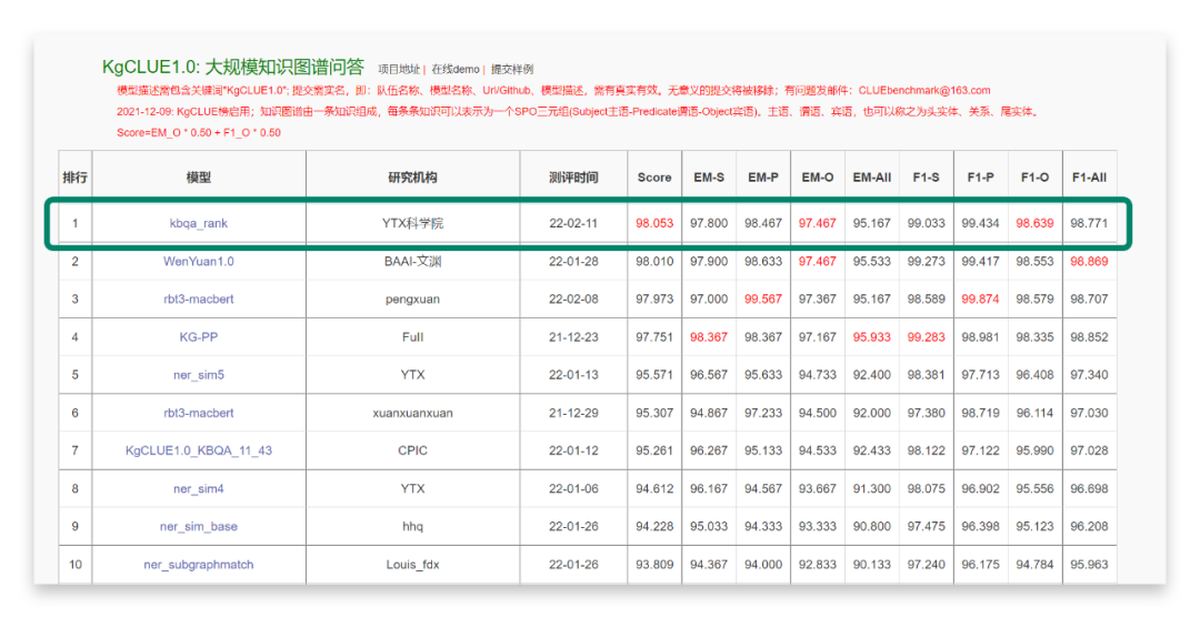 KgCLUE是中文语言理解领域最具权威性评测基准CLUE在知识图谱问答任务上的榜单。