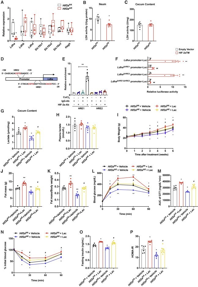 3、Hif2a通过调节Ldha的表达来调节肠道乳酸水平,同时给药乳酸治疗可以逆转Hif2aΔIE小鼠的有益作用