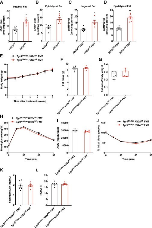 研究者通过检测胆汁酸的关键膜受体TGR5的表达模式,发现Hif2a△IE和Hif2a△IE粪菌移植(FMT)小鼠的腹股沟和附睾脂肪组织中TGR5的基因表达显著增强,TGR5的激活导致cAMP水平升高。为了验证脂肪组织中TGR5在Hif2a肠道特异性敲除小鼠中的关键作用,研究者又将Hif2afl/fl 和Hif2a△IE的粪便微生物分别移植到脂肪组织特异敲除Tgr5的小鼠中,发现小鼠的食物摄入量、体重、体脂含量或胰岛素敏感性没有差异。研究结果表明脂肪TGR5信号通路在FMT引起的代谢改善中起着关键作用。