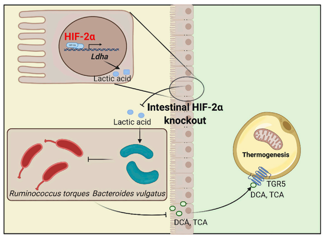 肠道Hif2a通过调节Ldha诱导表达改变B. vulgatus和R. torques之间的平衡,导致DCA和TCA水平降低。它通过脂肪-TGR5引起抑制产热的作用。这些发现加深了人们对宿主基因调控微生物组的机制的理解,并为治疗代谢性疾病提供了一种新的策略。