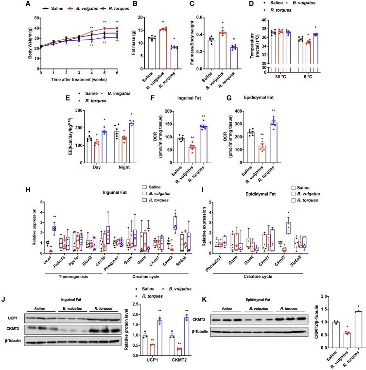 B. vulgatus和R. torques通过灌胃至6周龄小鼠体内,发现B. vulgatus的加入可加速体重增加,体脂含量增加,降低胰岛素抵抗,而补充R. torques则改善了肥胖、葡萄糖稳态和胰岛素敏感性。关于产热作用,B. vulgatus和R. torques对体温、能量消耗、RER和耗氧率(OCR)的影响也是相反的。B. vulgatus和R. torques的改变可能是Hif2a肠道特异性缺失通过胆汁酸-TGR5-UCP1/CKMT2轴诱导WAT产热的主要原因。