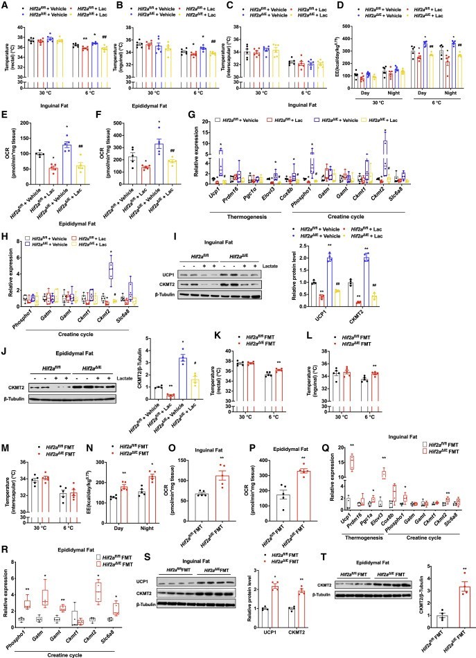 研究者通过评估实验组和对照组小鼠中的几个产热指标,发现在常温下,两组小鼠的直肠温度相似;但在冷环境下,实验组小鼠的直肠温度则出现了显著升高。进一步研究实验组和对照组小鼠的直肠/腹侧/背侧温度、能量消耗、RER、体外氧耗率以及与肌酸周期相关的生热基因的表达等分析发现,Hif2a△IE小鼠的肠道微生物群主要通过腹股沟脂肪组织中的UCP1以及腹股沟和附睾脂肪组织中的肌酸循环促进产热。