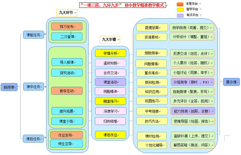 课题组依托“洋葱+平板”和“洋葱+希沃”两种课型,积极开展初中数学精准教学模式的研究:集体备课,发布预习,制作课件,上公开课,听评课,完善教学设计,撰写案例分析。经过一年多的磨课、实践、研讨,逐步形成“九环九步”精准教学模式。课题组教师用心研读相关文献和书籍,学习精准教学的理论知识,研讨国内精准教学的研究成果,开展同上一节课活动。为落实“以学定教”,“减负增效”的目标,我们依托智能平台生成的学情数据报告, 合理设计教学环节和教学步骤,“以点带面”,推动数学教师精准备课,精准上课,精准评价。基于洋葱、希沃智能技术和讯飞大数据平台,反复实践两种课型,重构课堂教学内容,形成“优质高效”模式。