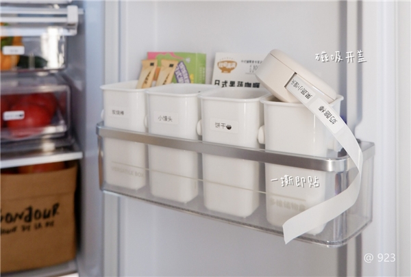 比如,你可以使用小粉饼标签机给调味品瓶瓶罐罐贴上名称标记,方便识别取放。你可以给冰箱中储存的各类干货、食材用收纳箱分装,再贴上有购买日期、保质期的标签纸,避免食材过期食用。不同使用场景的厨房餐具也可以用小粉饼做好标记,防止混淆使用。与手写纸相比,汉印标签机不仅让厨房分类更便携,统一视觉看起来也更整洁有序。