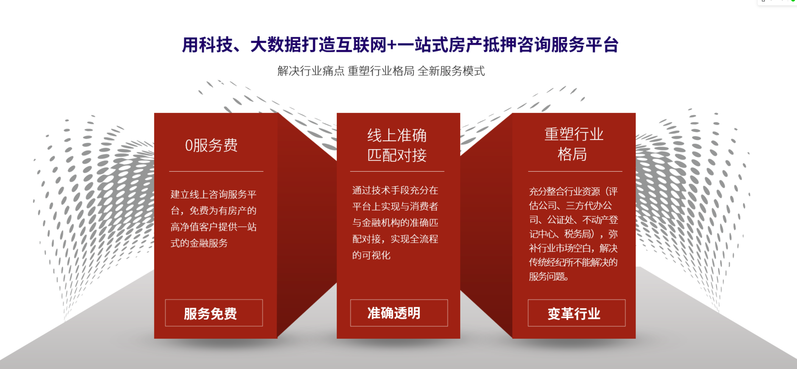 公司以“互联网+”为契机,通过免费为高净值人群提供快速便捷的房产抵押政策咨询服务获得规模化私域流量,以科技、大数据技术为抓手,搭建精准对接平台,以解决行业收费不透明、不合理、信息不对称、时效慢的痛点,作为行业开拓者,为未来有房产的高净值人群提供一站式顾问式服务。