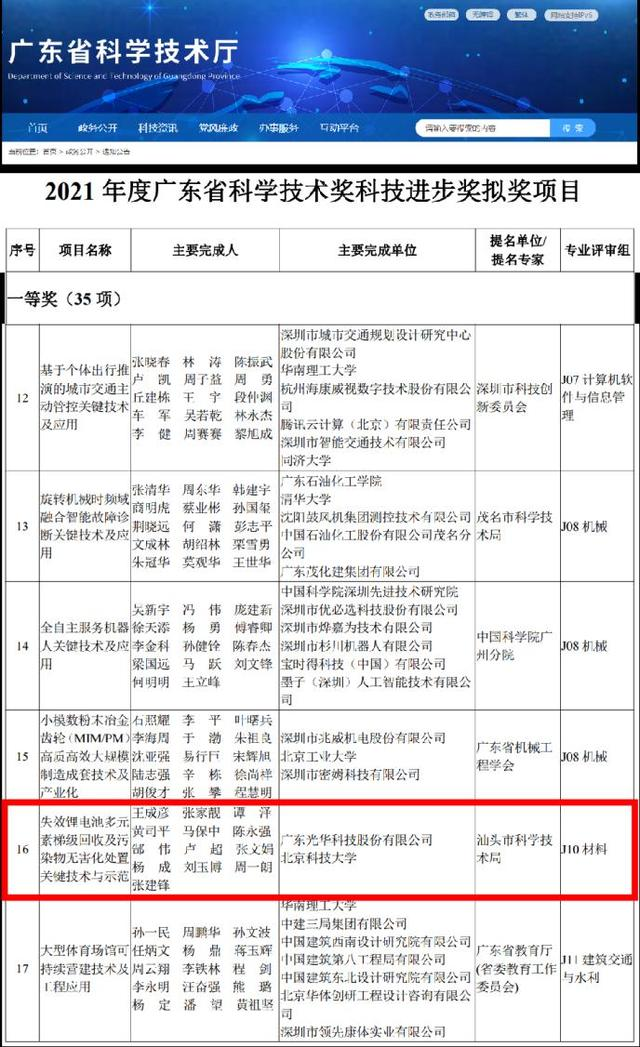 4月15日,广东全省科技创新大会在广州举行,颁发了2021年度广东省科学技术奖等奖项。记者获悉,由广东光华科技股份有限公司、北京科技大学作为主要完成单位的《失效锂电池多元素梯级回收及污染物无害化处置关键技术与示范》项目获得2021年度广东省科学技术奖进步奖一等奖。该项目创新开发具有完全自主知识产权的失效锂电池多元素梯级回收及污染物无害化处置关键技术,攻克了传统湿法流程存在的瓶颈问题,总体技术居于国际领先水平。