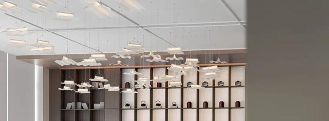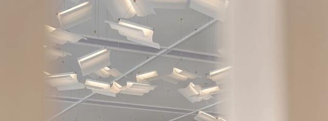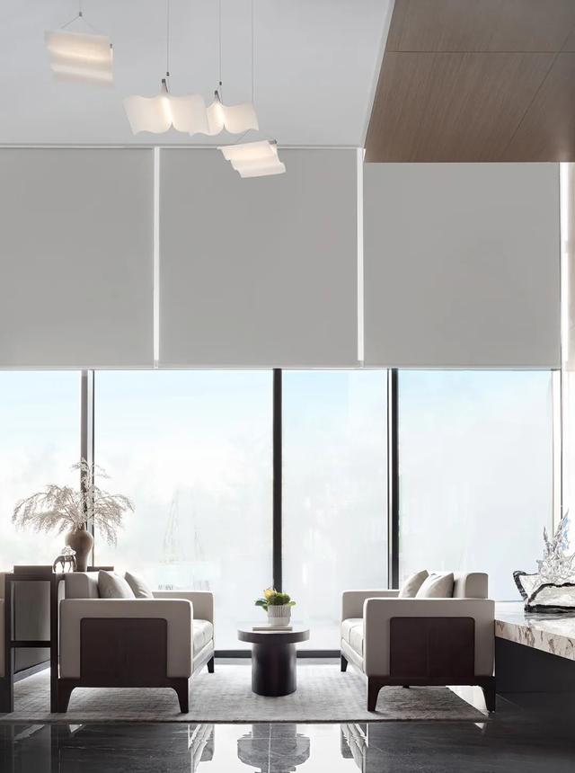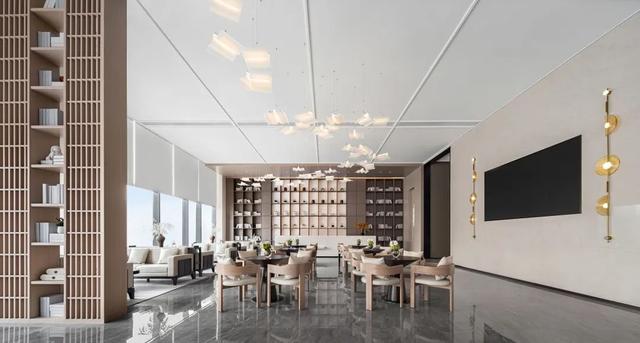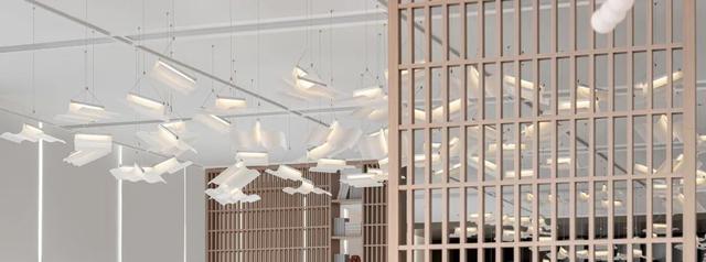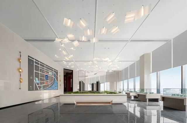 沙盘区,设计师以书为灵感,通过现代设计手法的解构与重建,最终以灯的形式在空中呈现。漂浮的书灯,似白鸽飞翔,似银河当空,丰富了空间。右侧大尺度落地玻璃,带来充足的自然光线,光影在室内自在游走,营造出一种静谧而无垠的广阔空间感。