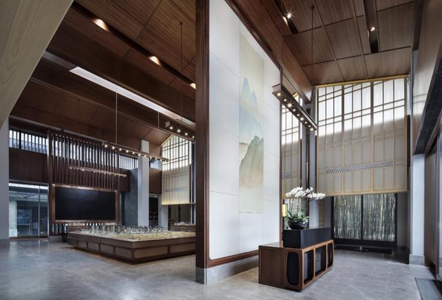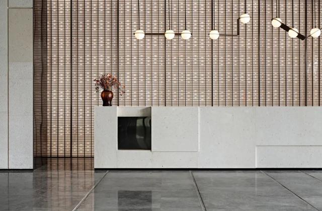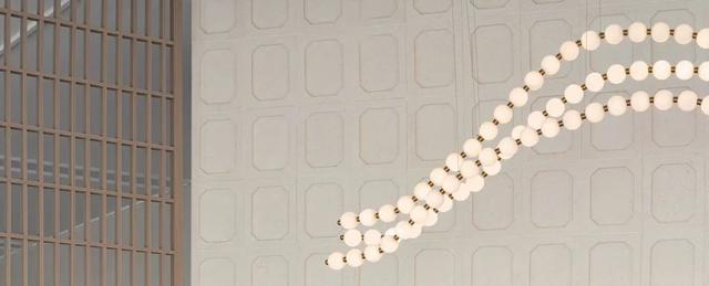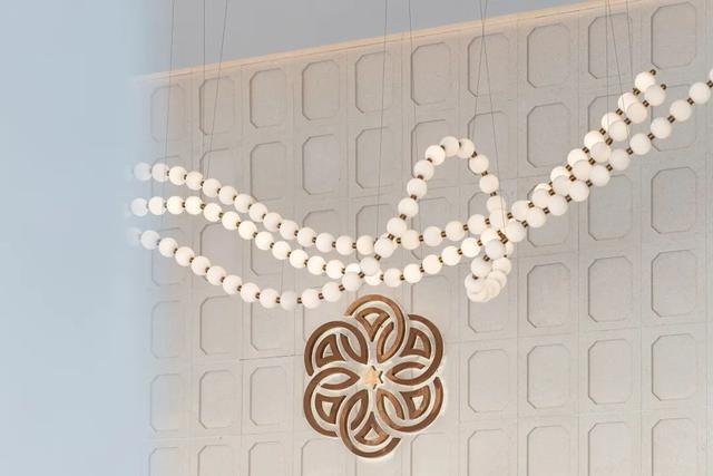 漂浮的灯带仿若散步的圆点,勾勒出优美的曲线,两侧木制格栅屏风以一定的角度向两边张开,好似展臂欢迎的姿态,将接待前台拥入怀中,用独特的方式展现出对宾客的热情与礼遇。