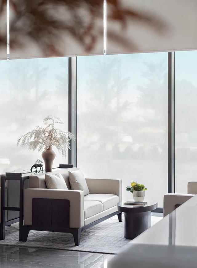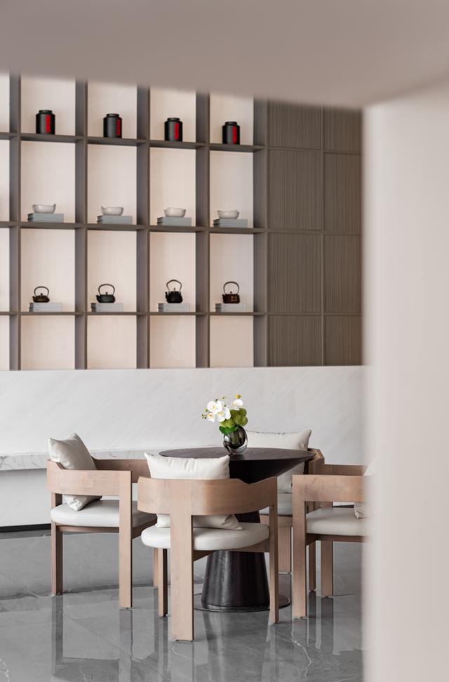 洽谈区,设计师利用不同量体的家具组合,并以此界定场域边线,巧妙规划功能布局;与此同时践行克制平衡之道,以纯净的形式、精简的手法描摹安静素雅的空间氛围,并赋予其文化内涵与美学气质。