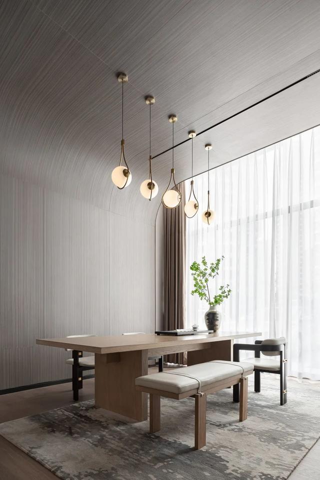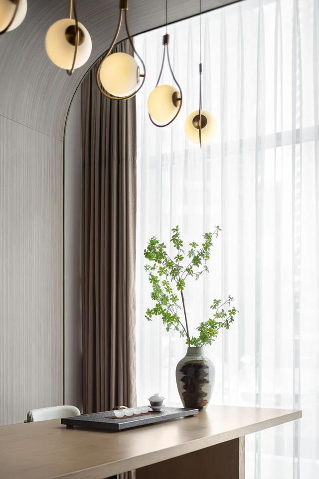 一花一世界,一叶一菩提,极富东方美学的沙发座椅舒适安逸,简约古朴的花艺蕴含隐隐禅意,呈现出平衡对称之美的壁灯仿若一对现代艺术作品,简朴的木质,素净的器物,在丰盈的空间中共同编织出宁静恬然之感与质朴闲静的优雅心境,孕育出不同于繁杂生活的闲。