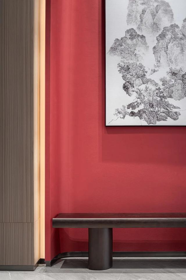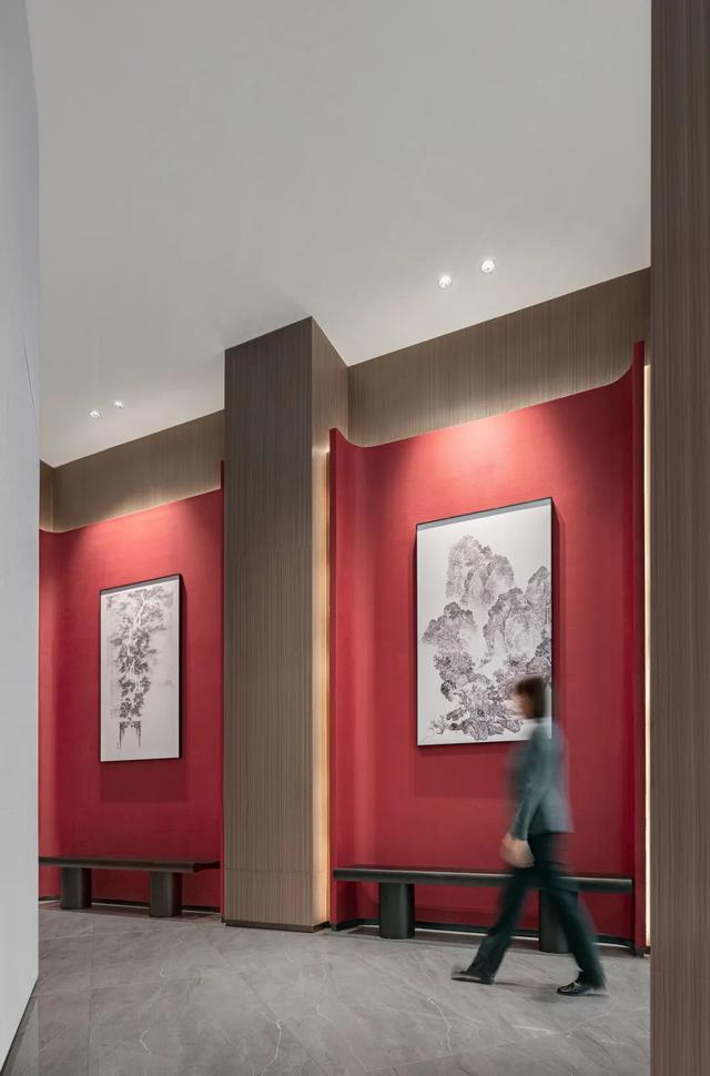 艺术画廊,设计师汲取东方雅致意趣,将温文尔雅和精致生活暗藏于内,对话东方美学风雅。一抹极具东方韵味的朱砂红,惊艳了空间,模糊了时间,随着脚步的移动,一幅幅中国山水画悠然地展现于眼前,随画入境,观者被带入另一悠远时空。艺术画廊式设计,让此处不仅只是商业的空间,亦是艺术的空间。