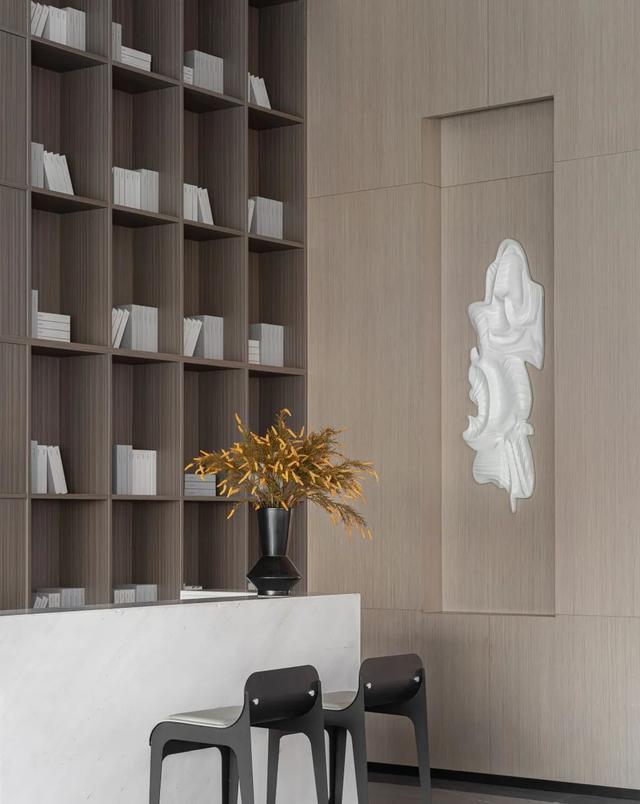 美是一种协调,一种和声。美即是各部分之谐和,不能增一分,不能减一分。接待厅,以素雅温和的木色系为总基调,描摹出现代轻盈的空间氛围;背景墙,几何图形以艺术化手法进行叠加阵列,呈现出强烈的序列美。