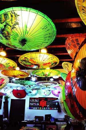 门脸不大,但尚未入室便可见充满古朴韵味的木质招牌,上书“若水堂”,正是伞店的名字。步入店门,一把把七彩玲珑的油纸伞挂在头顶,透过泛黄的灯光散发出温馨朦胧的光晕,竟生出“烛光点点”的绰约风姿,恍若时光倒转。