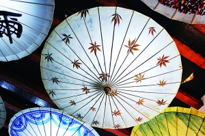 并蒂双蝶、工笔牡丹、荷塘情趣、独钓寒江雪、慧质兰心的古代仕女……这里的伞面既有复杂细致的工笔,也有浪漫朦胧的写意,全部由专业画师手绘,个别采用石版手工印刷。画好后用桐油固定,据说永不退色,而且越用越鲜艳。“我们鼓励顾客尽量在雨雪天气使用它,因为它具有极强的使用功能,绝不只是个摆设。”看到顾客不断赞叹油纸伞的“美貌”,店主忍不住提醒。
