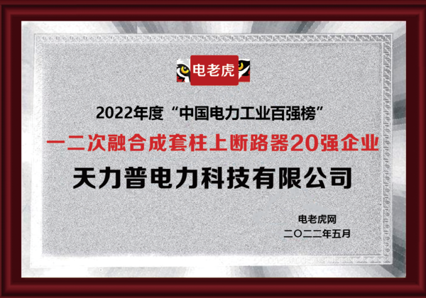 天力普电力科技有限公司凭借超强的综合实力以及品牌影响力等荣获2022年度“一二次融合成套柱上断路器20强企业”荣誉称号。