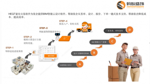 定位整装生态赋能,蚂蚁盛饰区别其他供应链平台的创新在于打造了“HEQT”量化交易软件,其中包含HEDA(智能云设计)系统,HEIA(智能云签单)系统、HEOA(智能云工厂)系统,分别对应家居产业电子设计自动化、家居产业电子询价/报价自动化、家居产业电子拆单/下单生产自动化。
