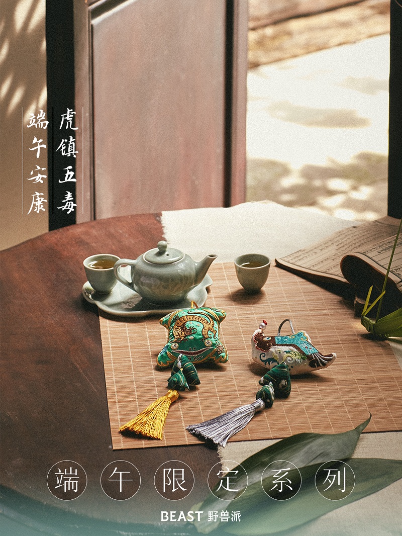 五月初五,需“驱五毒”,民间也早有“戴个香草袋,不怕五虫害”的俗语。今年端午,野兽派力邀上海刺绣设计师、画家金艺老师,设计一款既不失传统风范,又保留可爱有趣的香囊。于是,野兽派的第一款端午香囊组合也应运而生——【端午安康】香囊,创新采用了鮟鱇鱼的形象,鱼鳞花纹便都变成菖蒲、艾草等传统纹样,头顶小珠子,眼睛滴溜溜向后瞧,醒目可爱;【虎镇五毒】香囊的设计则采用了端午“降五毒”的传统,以咧嘴笑的蛤蟆为主体,再将蛇、蜈蚣、蝎子、壁虎绣于四角,中央镇上艾虎,以形寓意,简单几笔勾勒得灵动精神。