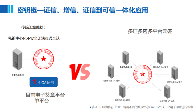数字化改革的纵横高速发展,伴随着多证合一的推广使用,电子认证与电子印章逐步得以普及。电子印章分为电子公章和电子私章。电子公章是由电子营业执照版式文件、ca证书、国密算法、印章章模。电子私章是个人身份信息、ca证书、国密算法、签名或加指纹进行匹配。在数字化时代,每个人都应该配备自己的个人电子签名章,一次认证终身使用建立长效机制,是个人征信的最好工具,也是打造诚信社会的核心抓手。传统电子印章分为两种形式:1、证书私钥章模等分发至U-KEY,该方式虽符合电子签名法但使用不方便,不同的服务平台(各类金融机构、政企服务平台、电子合同服务商等)均有各自不同的证书密钥,众多的U-KEY不利于高效的企业管理。2、私钥中心化部署既不符合电子签名法又不安全。同时以上两种方式都无法实现跨平台(跨省、跨地区)互通互认。而5G玺芯集证通超卡及密钥链技术能分别解决上述痛点: