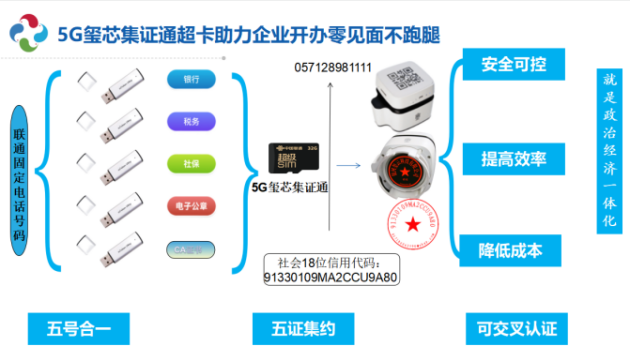 5G玺芯集证通超卡预装了各类证书密钥,拥有强大的可信认证能力,可为数千项“放管服”零见面不跑腿项目提供有力的工具与抓手。通过征信要素的不断叠加,电子印章还可升级成为征信印章,在一网通办的基础上实现一章统办,可广泛应用于企业及个人各种资质申请、各类金融服务等事项的全要素快速申报。助力全国统一大市场构建新发展格局提供强有力工具和抓手,证信增信证信到可信一体化应用为国家治理诚信社会生态建设提供浙江方案。