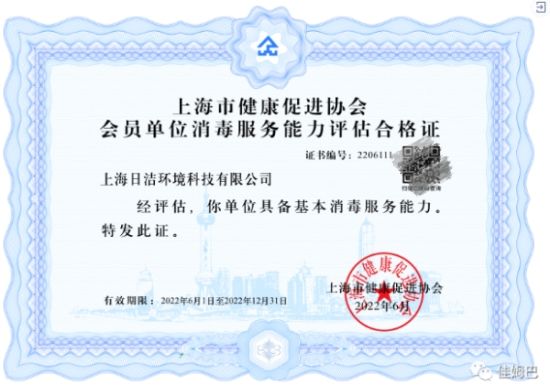 该公司还先后获得了上海市健康促进协会颁发的《上海市健康促进协会会员单位消毒服务能力评估合格证》以及上海市消毒品协会颁发的《消毒企业服务资质证书》这两项消毒行业的权威证书。