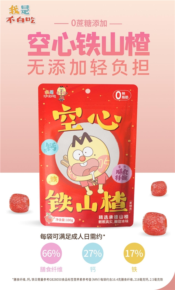 有一种零食,既可以满足味蕾对酸甜的追求,又可以补充各类营养和微量元素,它就是空心铁山楂。近日,国民级美食动画IP【我是不白吃】又出美味新品了!空心铁山楂正式加入了我是不白吃零食大家族,解锁了各种山楂新奇吃法,给广大粉丝更多的零食选择。这是继藕的脆片之后,又一备受粉丝期待的零食产品。【我是不白吃】依托着强供应链能力,不断拓宽商业化路径,引领业内新消费品潮流。