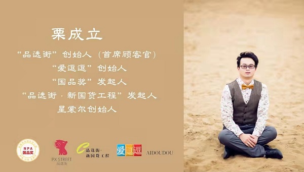 “爱逗逗”创始人栗成立先生,同时也是“国品奖”发起人,也是“品选街”创始人(首席顾客官),又是“品选街·新国货工程”发起人。