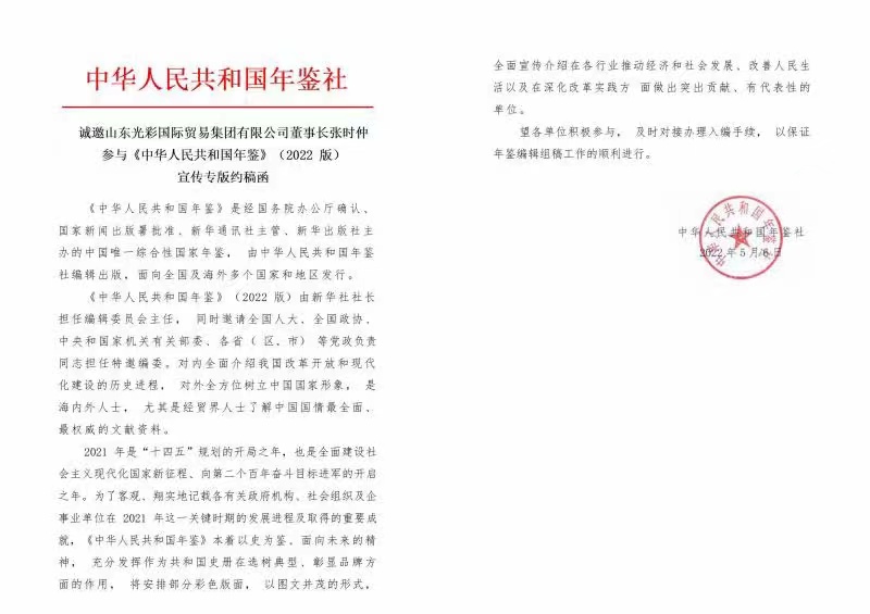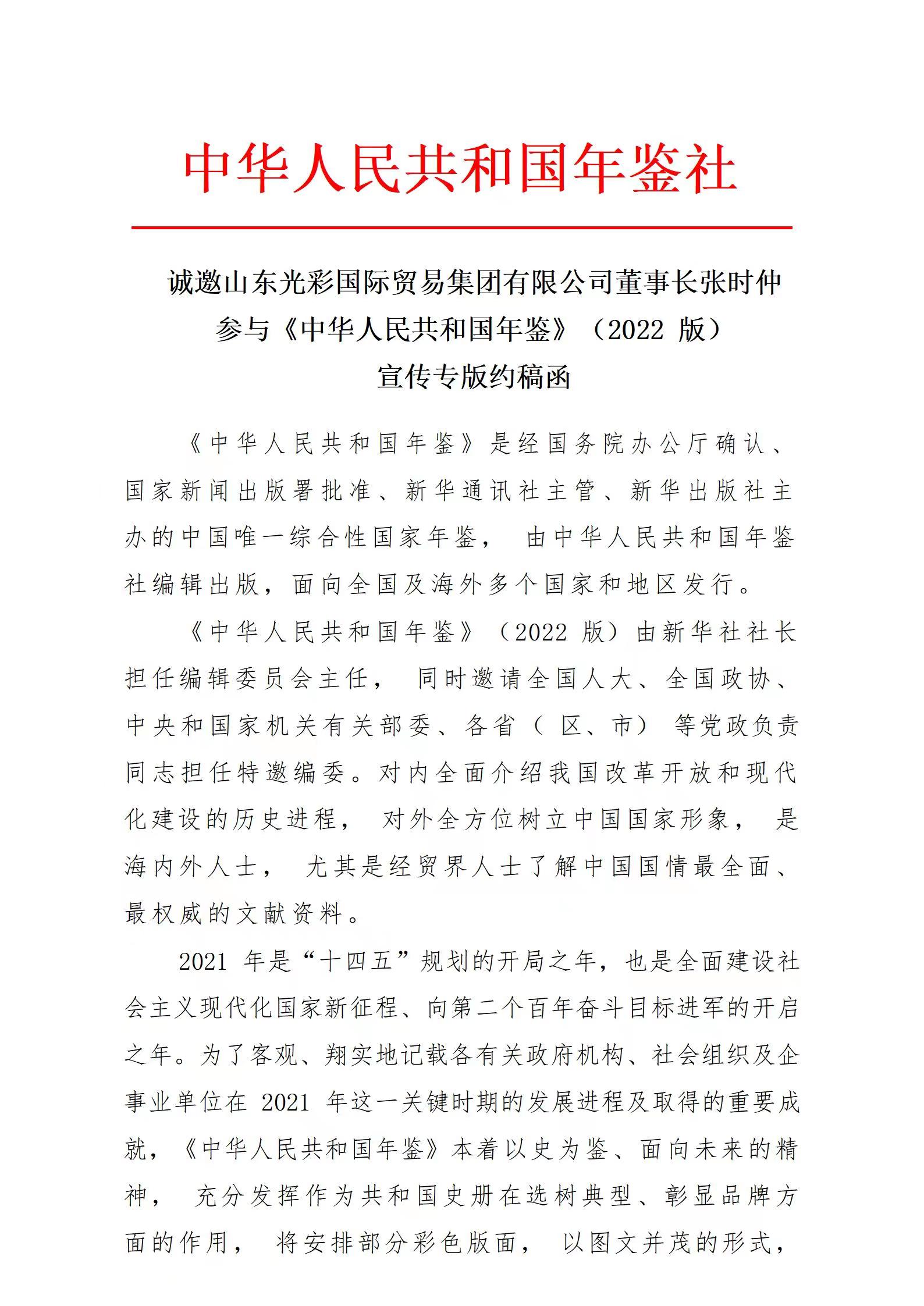 :山东光彩国际董事长张时仲受邀参与中华人民共和国年鉴...