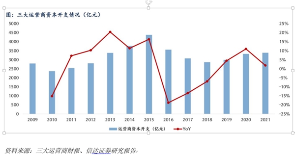 以国内三大运营商为例, 2009年工信部发放3G牌照,三大运营商投资在后续年份稳步上升。2013年工信部发放4G牌照,2015年三大运营商投资达到峰值,之后逐年下滑2017、2018年跌至谷底,2019年随着5G牌照的发放重新开始回升。