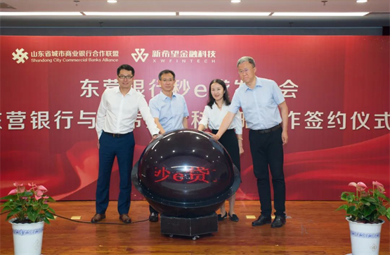 6月9日,东营银行召开“秒e贷”发布会暨与新希望金科战略合作签约仪式,东营银行行长陶文军、副行长李德星,山东省城商行联盟副总经理鲁静,新希望金融科技公司执行总裁周旭强共同为“秒e贷”系列产品揭幕。