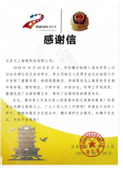 目前,爱上智能将L4级自动驾驶无人车运用到第七届世界军事运动会安保任务中。军运会期间累计巡逻时间超过400小时,其中夜间巡逻时长超过100小时,巡逻里程共计近600km;共受理一键求助29起,采集人脸图片8.2万张,实时比对发现重点人员76人。圆满完成第七届世界军人运动会国际级安防保障任务,“智能巡警”的安全性、稳定性与爱上智能高效运营能力得到充分验证,超强警务实战能力获得国家各级领导与武汉公安高度认可,为更多城市立体安防发展树立行业示范性标杆。武汉市公安局还特发感谢信,高度肯定“智能巡警”能力价值 。